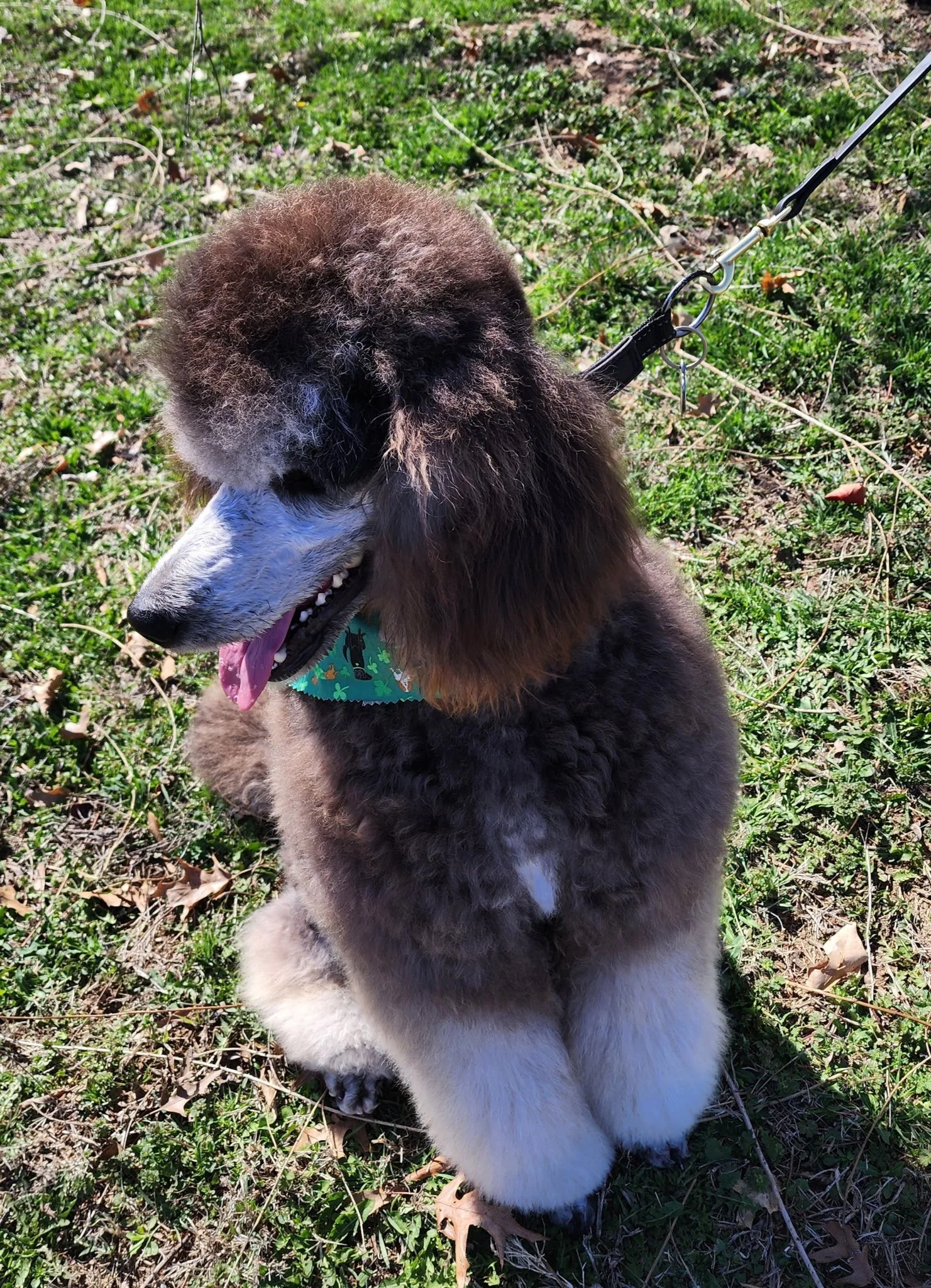 Chloe is a breathtaking silver Standard Poodle and the daughter of our beautiful Aspen. She inherited her mother’s athletic grace and gentle, intelligent temperament, making her a wonderful combination of elegance and playfulness. Her shimmering silver coat and striking expression make her a showstopper everywhere she goes.